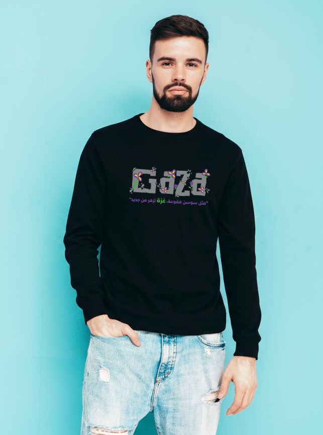 ファクア・アイリスはパレスチナの国花。瓦礫に咲くアイリスに、ガザの復興への祈りを込めました。ガザへの寄附つき商品。長袖シャツの他、スウェットとフーディをお届けします。11月10日まで!